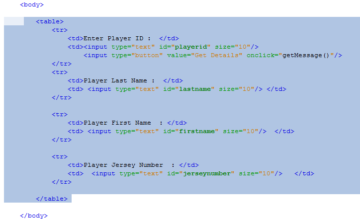 AjaxRestClient.htmlのbodyセクションに以下のコードを追加します。 <table> <input type="button" value="Get Details" onclick="getMessage()"/> <tr>