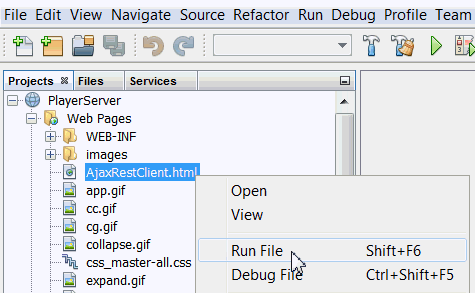 以下の手順を実行します。 a. projectsペインで「PlayerServer」プロジェクトを選択します。 b. 右クリックして「open」を選択します。コード・エディタにAjaxRestClient.htmlが表示されます。