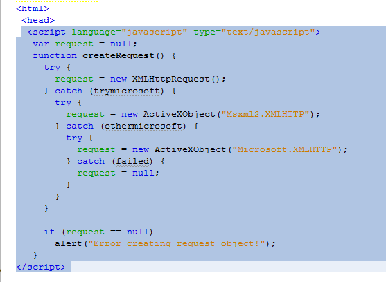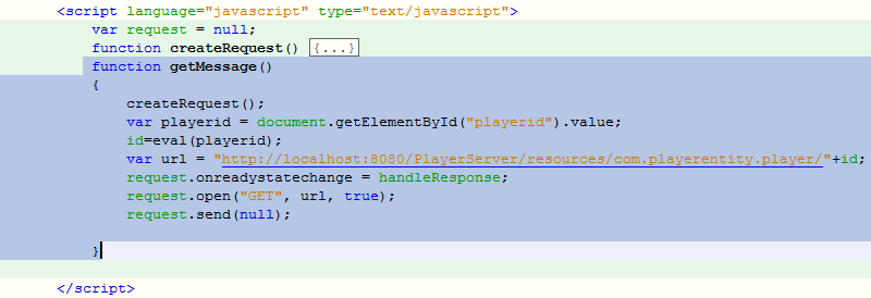 Ajaxリクエストを作成するために、AjaxRestClient.htmlページのheadセクションに以下のコードを追加します。 <script language="javascript" type="text/javascript"> function createRequest() { if (request == null)