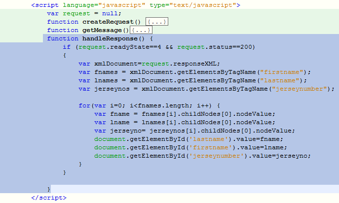 このメソッドは、サーバーからのレスポンスを処理するために呼び出されます。 handleResponse()メソッドはXML文書を解析し、取得した値をHTMLのテキスト・ボックスに割り当てます。 |