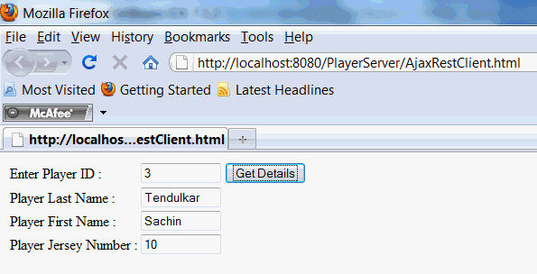 このチュートリアルで使用するサンプル・アプリケーションは、特定のプレーヤーIDに基づいてプレーヤーの詳細情報を取得するものです。 プレーヤーIDは問合せ文字列としてWebサービスに渡されます。このWebサービスはその後、プレーヤーの詳細情報をXML/JSON形式で送信します。 詳細情報には、プレーヤーの名、姓、Jersey番号が含まれます。