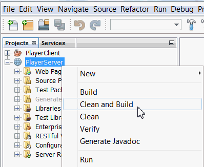 projectsペインで「PlayerServer」プロジェクトを選択します。 次に右クリックして、「Clean and Build」を選択します。
