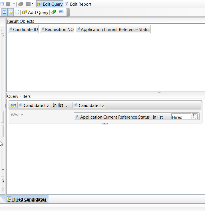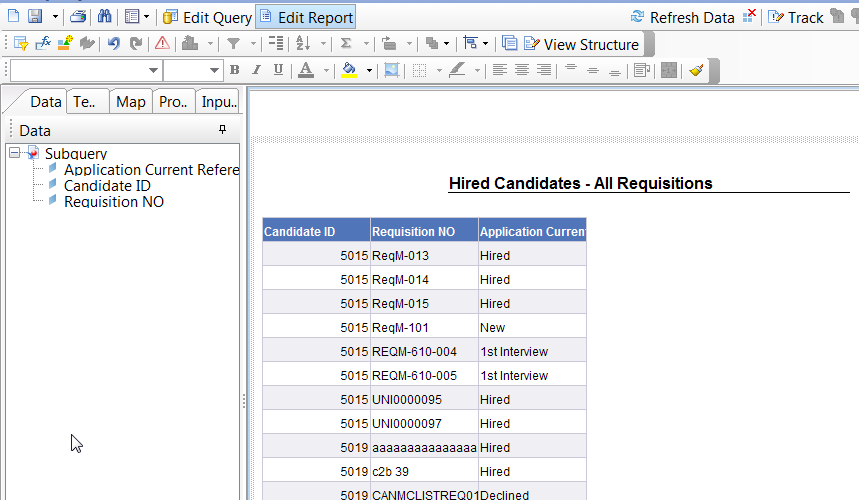 Observe that there is one query which returns the candidate id, requisition no, and applicaiton current reference status of candidates that have been hired on at least one application. |