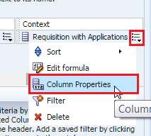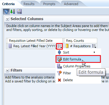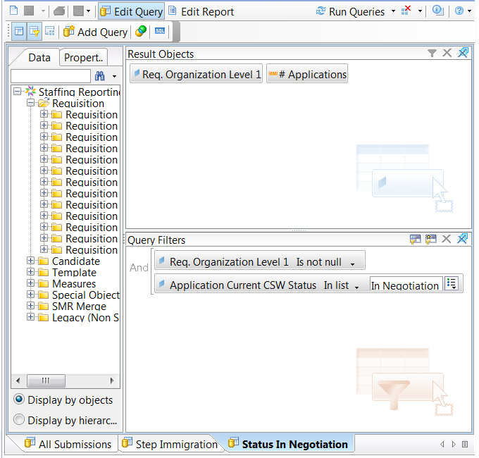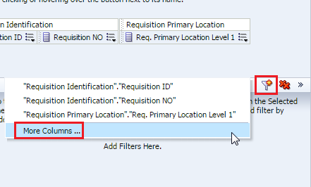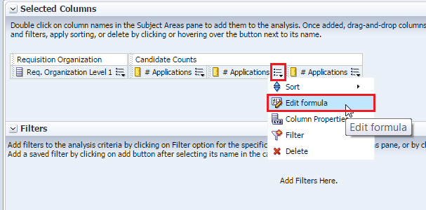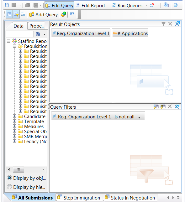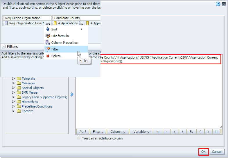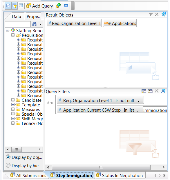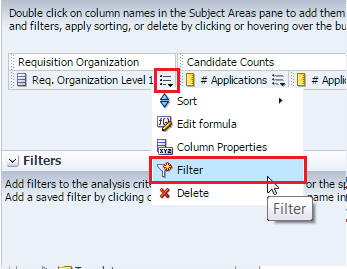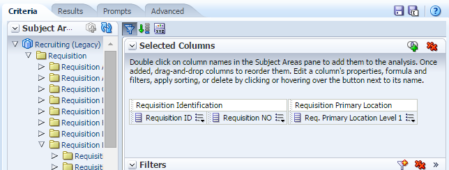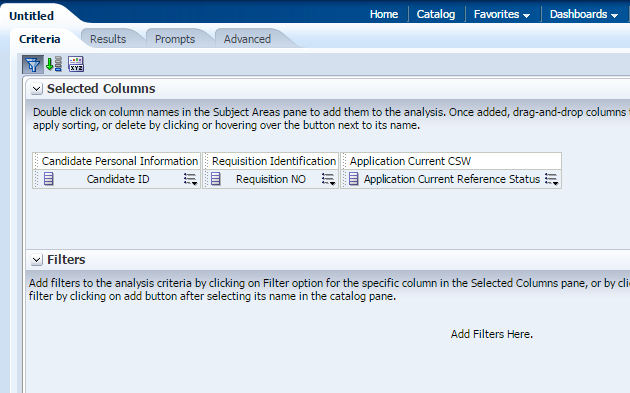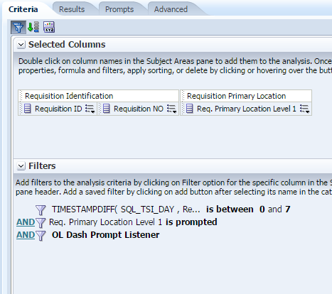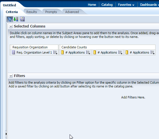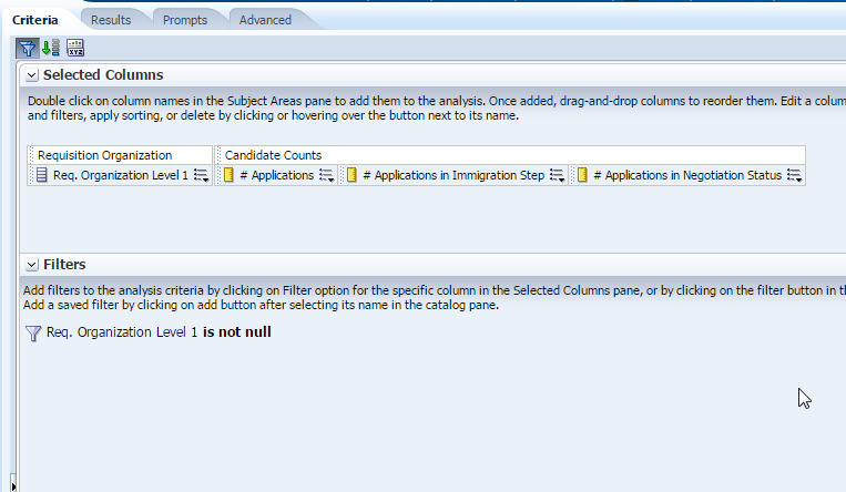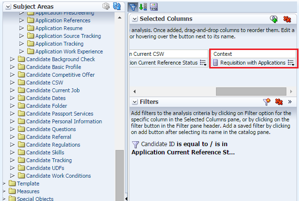 Since the analysis retrieves data from Requisition and Application we will add a context field in the criteria. This differs from BO in that we add the context to the query and do not choose the context when the query is run. If you have a report where the end user will need the context to change you can add a column selector view on the context column in the results tab, but that is not necessary for this report. Add the column Context > Requisition with Applications