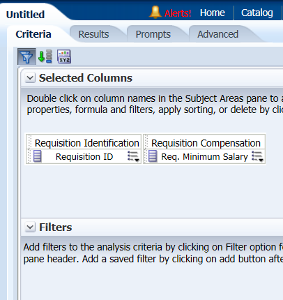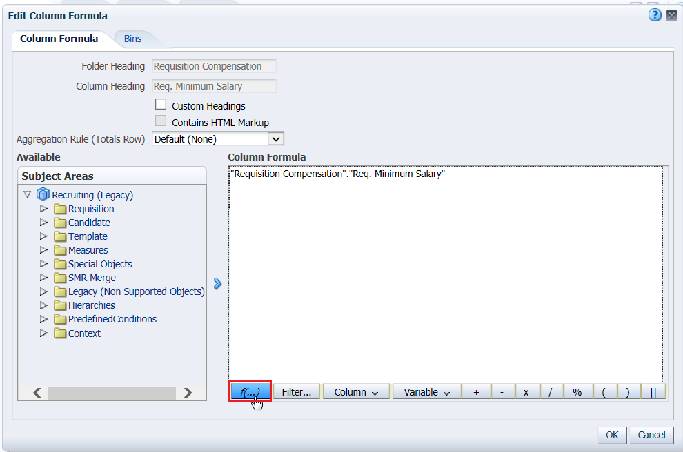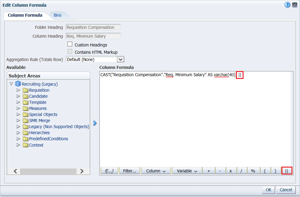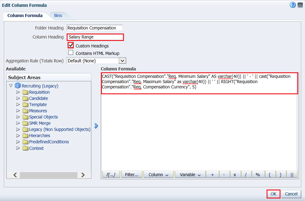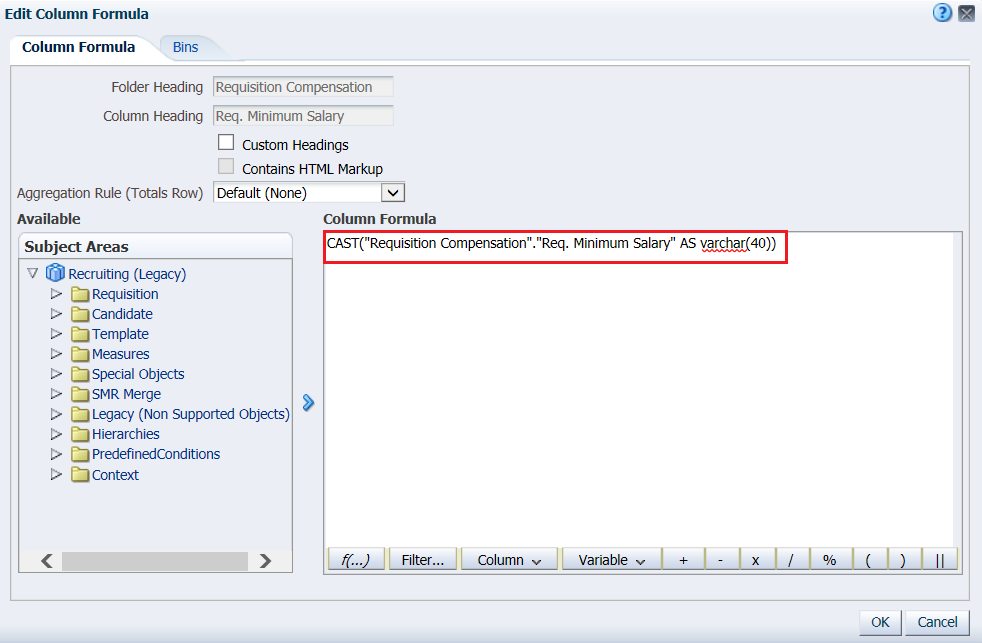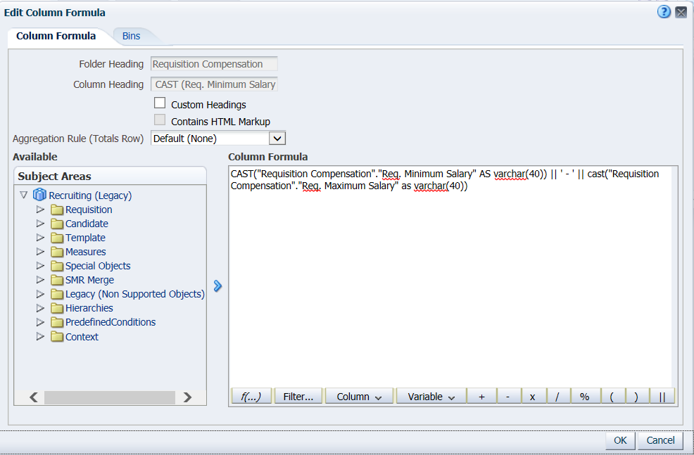 Since the formulas we are creating are used in a query using the correct data type is imperative to the query running. In our first example we are using a concatenate function and all values in the concatenated formula must be in string formula. If you try to concatenated a non-string to a string you will get a syntax error similar to: Function Concat does not support non-text types. For our first analysis we need to create an analysis that shows the salary ranges for requisitions. Create the analysis using theRecruiting (Legacy) subject area.