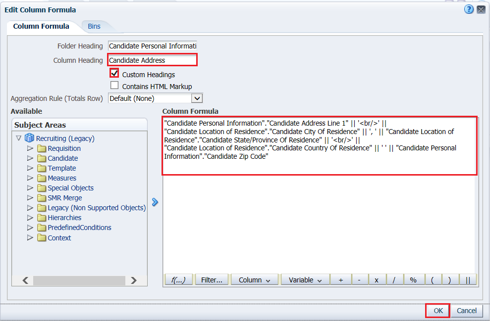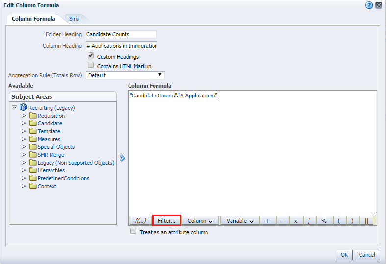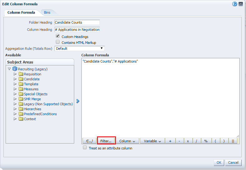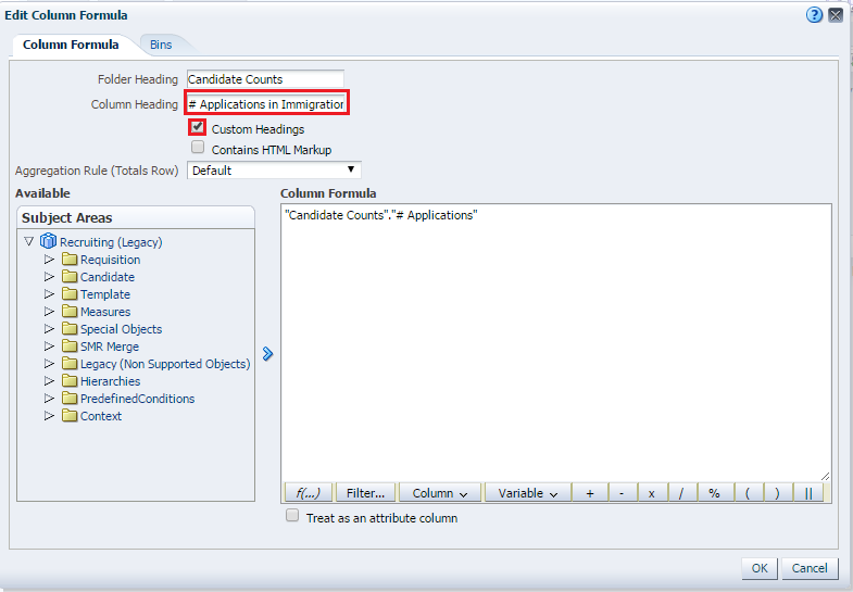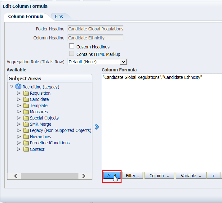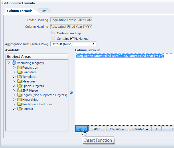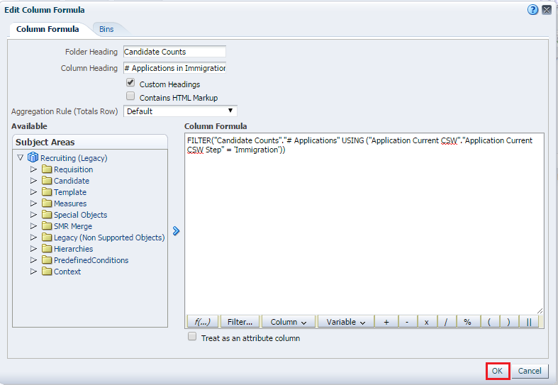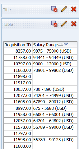 Since the formulas we are creating are used in a query using the correct data type is imperative to the query running. In our first example we are using a concatenate function and all values in the concatenated formula must be in string formula. If you try to concatenated a non-string to a string you will get a syntax error similar to: Function Concat does not support non-text types. For our first analysis we need to create an analysis that shows the salary ranges for requisitions. Create the analysis using theRecruiting (Legacy) subject area.