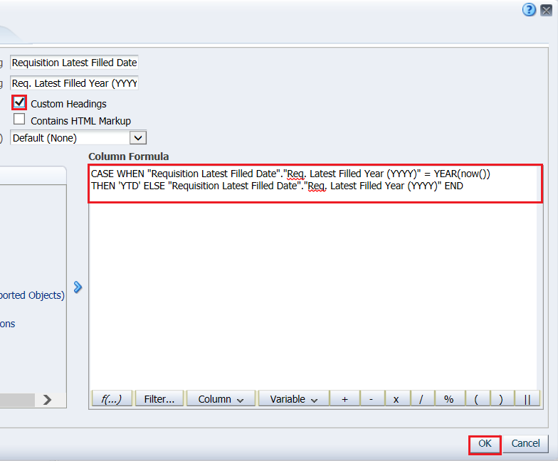 Modify the syntax to the following: CASE WHEN "Requisition Latest Filled Date"."Req. Latest Filled Year (YYYY)" = YEAR(now()) THEN 'YTD' ELSE "Requisition Latest Filled Date"."Req. Latest Filled Year (YYYY)" END