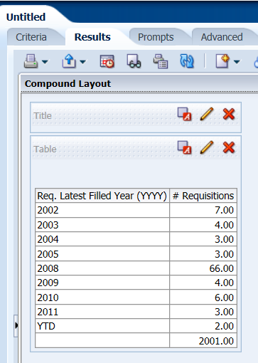 The first requirement we will build on is the requirement to show the # of filled requisitions by year and to mark the current year as YTD (year to date). Create the analysis using theRecruiting (Legacy) subject area.