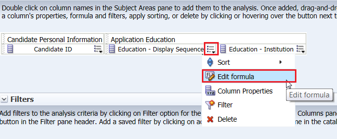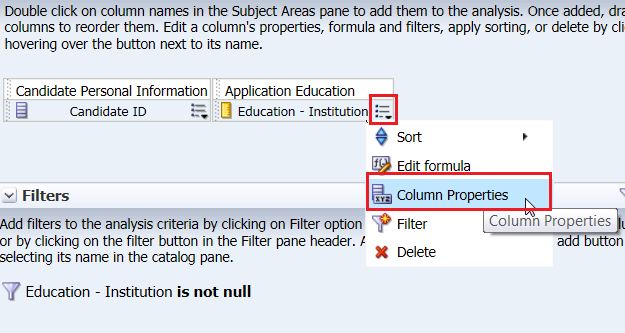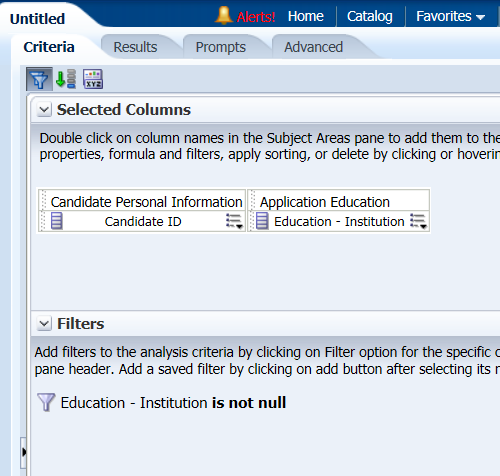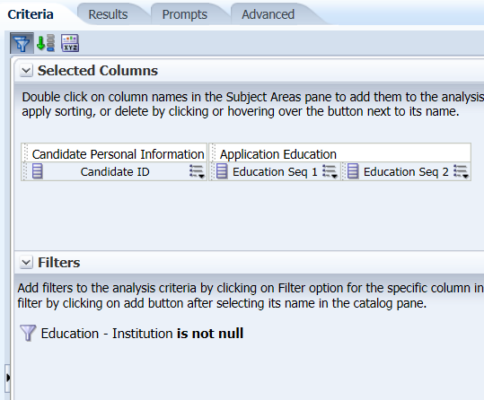The second requirement we will build on is the requirement to return the candidate id and educational institute at display sequence one and two in the application file. Create the analysis using theRecruiting (Legacy) subject area.