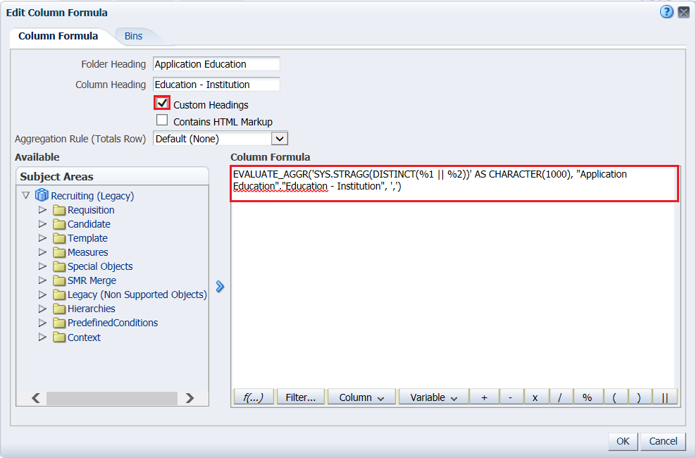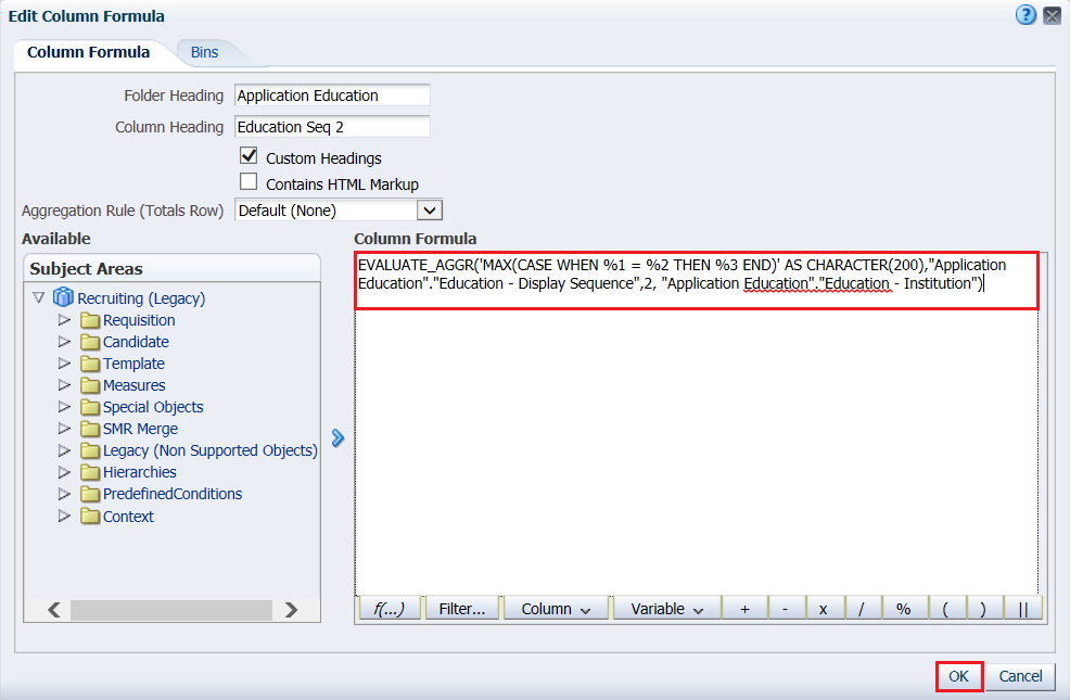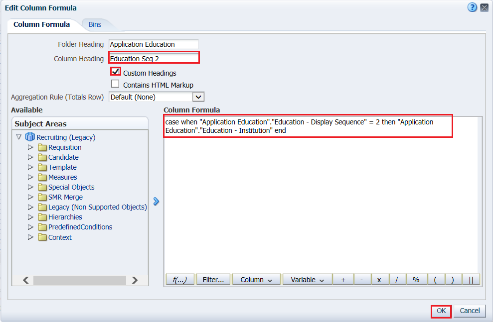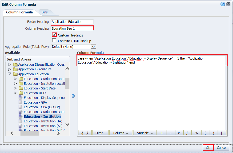 Edit the remaining Education - Display Sequence column and enter the following information. Select Custom Headings and and insert Education Seq 2 in the column heading. Insert the following function: case when "Application Education"."Education - Display Sequence" = 2 then "Application Education"."Education - Institution" end