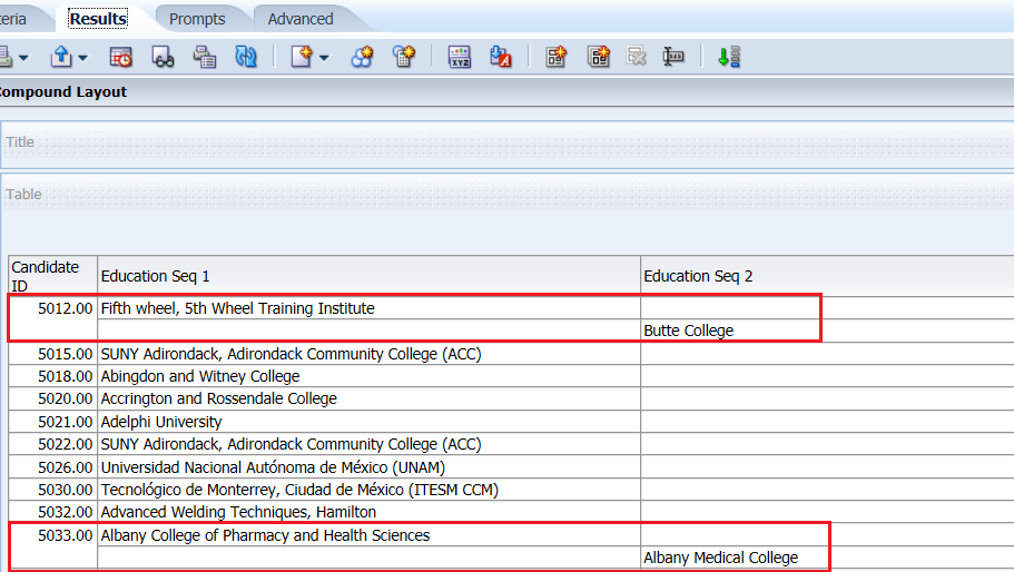 Select Custom Headings and and insert Education Seq 1 in the column heading. Insert the following function: case when "Application Education"."Education - Display Sequence" = 1 then "Application Education"."Education - Institution" end