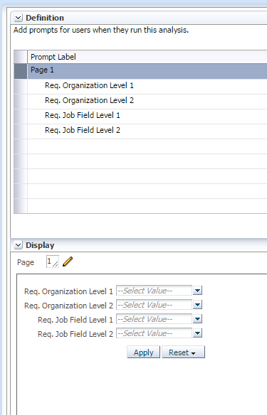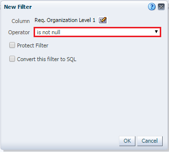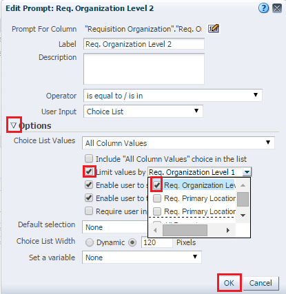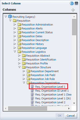 Expand the options and limit the values by Req. Organization Level 1. Note: This is an enhancement that was not present in the BO report