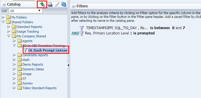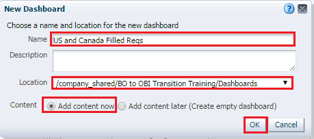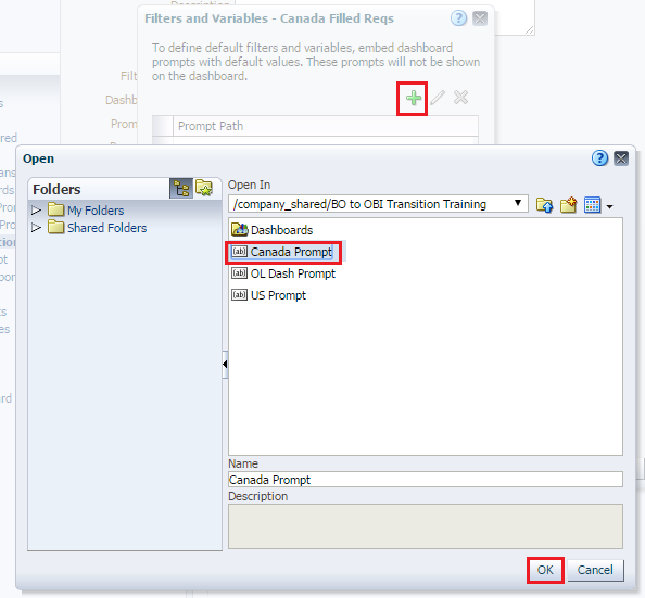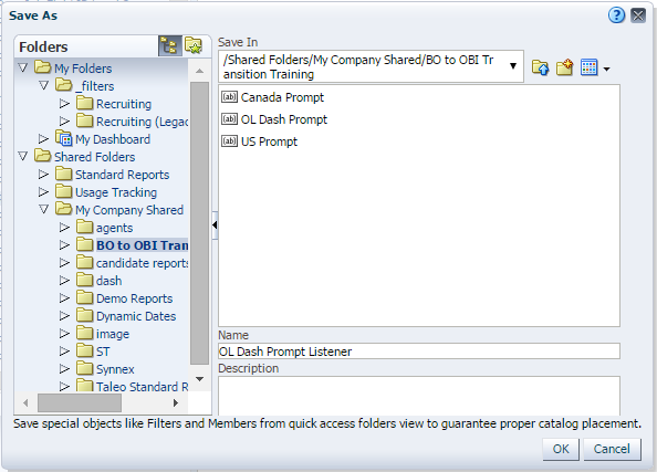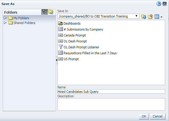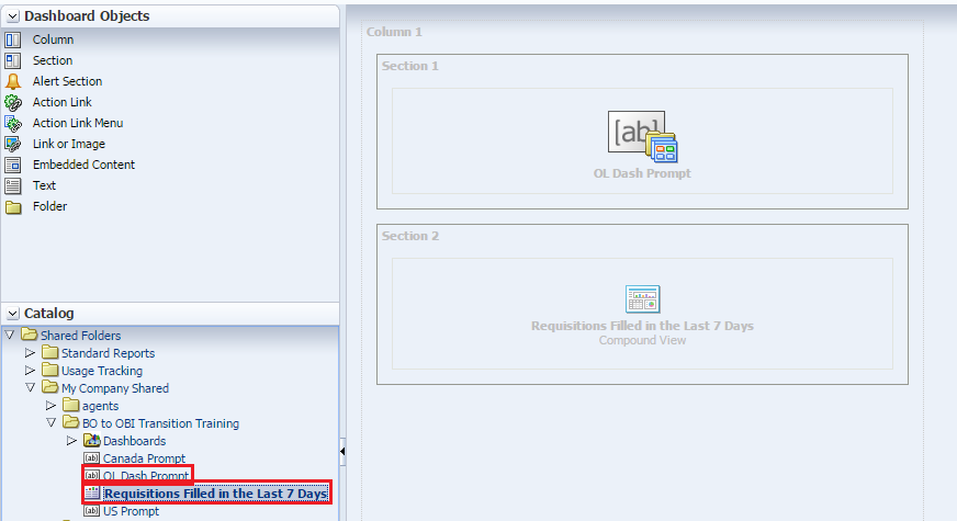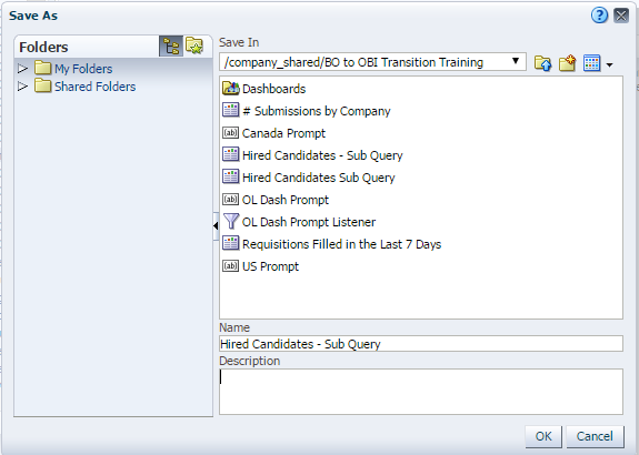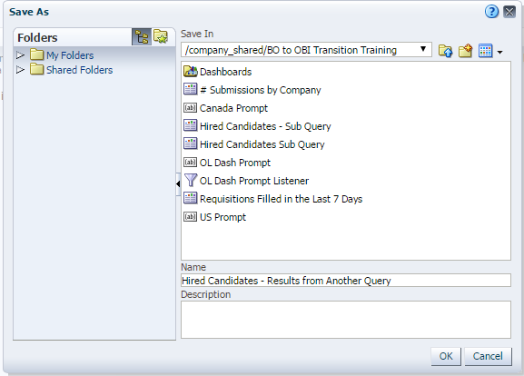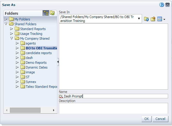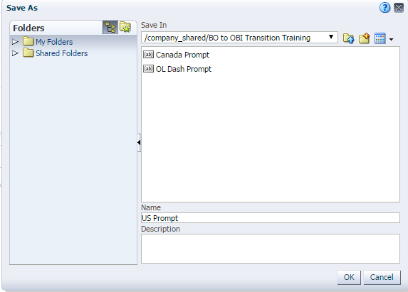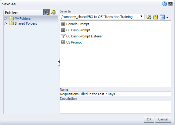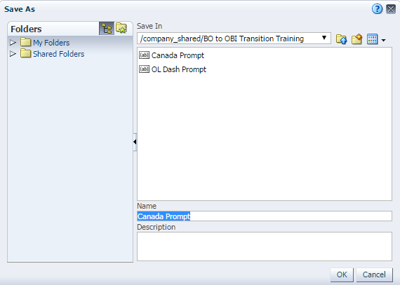 Save the dashboard prompt as OL Dash Prompt in My Company Shared > BO to OBI Transition Training.