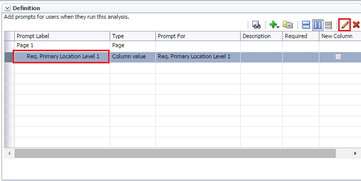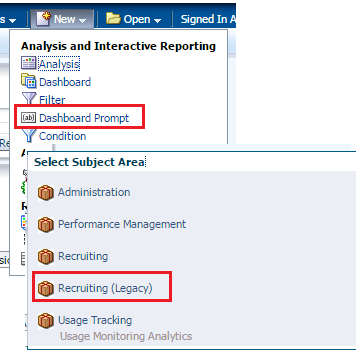 Create a new dashboard prompt and select the Recruiting (Legacy) subject area..