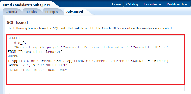 Modify the SQL to remove leaving only the Candidate ID field in the select statement, the from clause, and the where clause: SELECT Now you have both the analysis and the sql syntax to recreate your BO report that has a sub query in the filter |