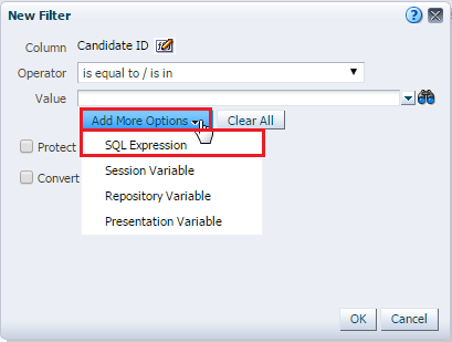 In the New Filter dialog box select SQL Expression from the Add More Options drop down menu.