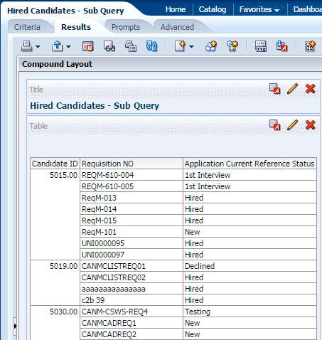 Observe that the report consists of one table that returns the three query result objects. Based on my observations I have determined that this report can be re-created in OBI. I will demonstrate how to re-create the sub query using results from another analysis and using a sql sub query. |