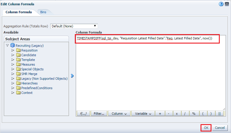In the formula editor enter the following formula: TIMESTAMPDIFF(sql_tsi_day, "Requisition Latest Filled Date"."Req. Latest Filled Date", now())