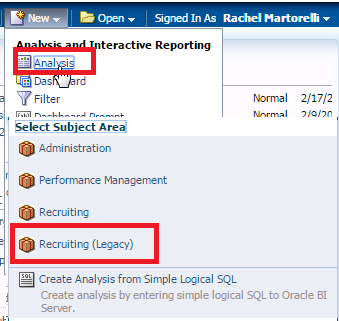 For speed and ease of transitions use the Recruiting (Legacy) subject area to convert all Staffing universe queries. Use Performance Management subject area to convert Performance Management Universe queries. Use Recruiting subject area to convert legacy Onboarding queries into contemporary Onboarding queries. |
