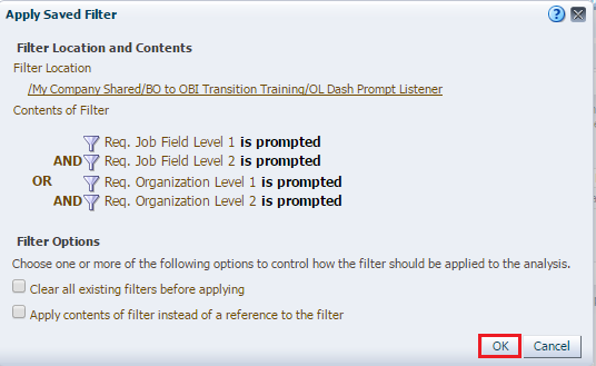 In the Apply Saved Filter dialog leave the defaults selected and click OK.