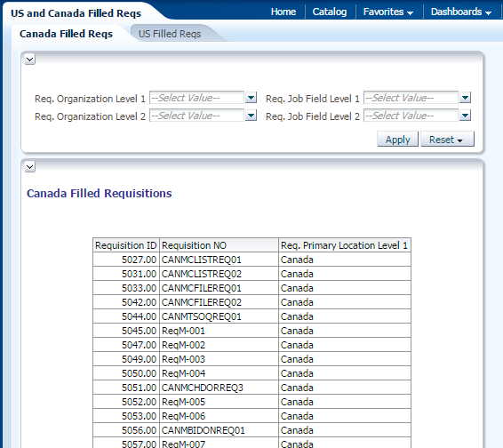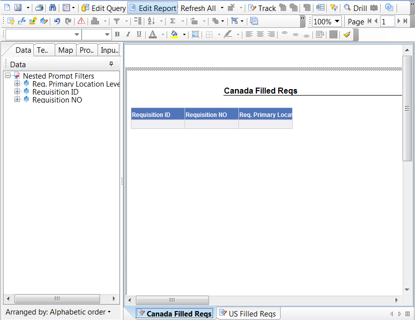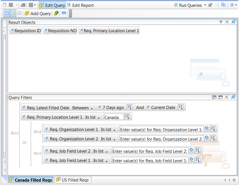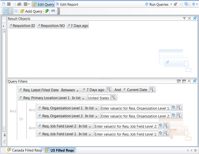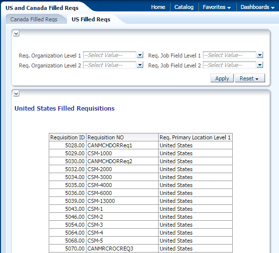 Observe that both reports contain information from a distinct query. Canada Filled Reqs report tab contains information from Canada Filled Reqs query and US Filled Reqs report tab contains information from US Filled Reqs query. |