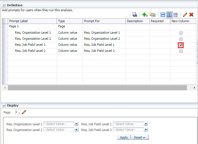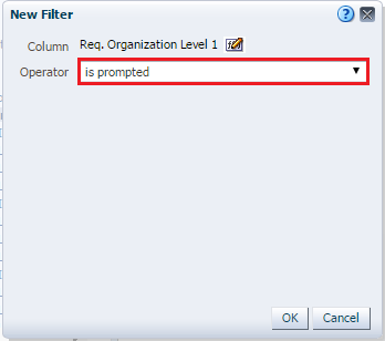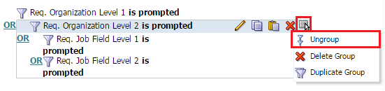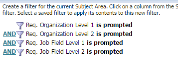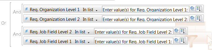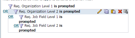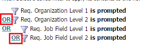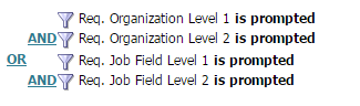Toggle the operand between Req. Organization level 1 is prompted and Req. Organization Level 2 is prompted from OR to AND, and the operand between Req. Job Field Level 1 and Req. Job Field Level 2 from OR to AND.
