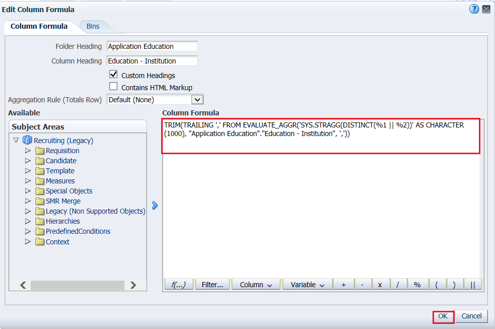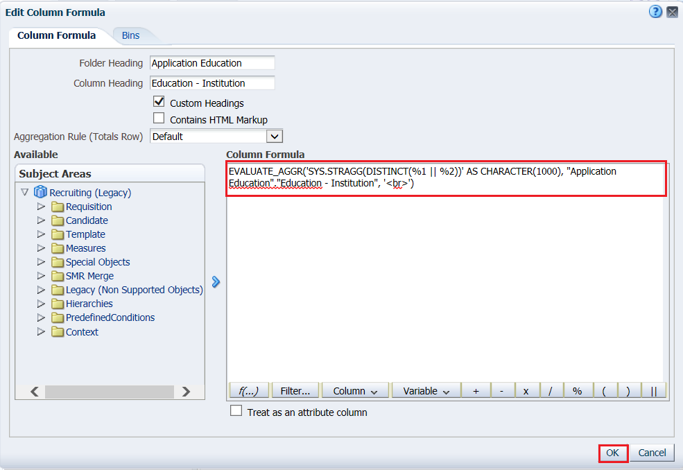 The aggregator gives you the option to create a line break delimiter so we will review how to use a line break in OBI Answers. Use save as to save the analysis as Line Break Delimited Agg List. Edit the formula of Education - Institution, remove the trim statement, and replace ',' with a line break tag '< br >'. The formula is now: EVALUATE_AGGR('SYS.STRAGG(DISTINCT(%1 || %2))' AS CHARACTER(1000), "Application Education"."Education - Institution", '< br >')