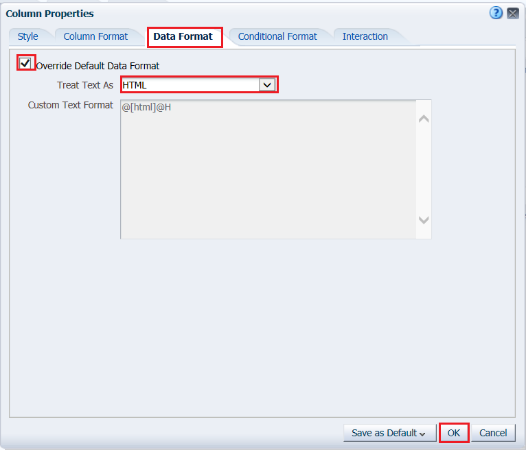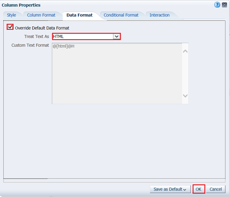 In the Data Format tab, override the default data format and set the treat text as field to HTML.
