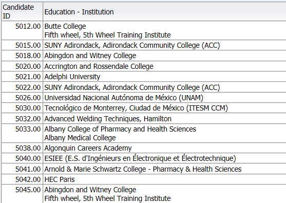 We will return to the criteria tab and modify the formulas using an evaluate statement in conjunctions with the case statement so the educational institutions are treated as different fields and display in the same row. Replace the equation in the column Education Seq 1 with the following formula: EVALUATE_AGGR('MAX(CASE WHEN %1 = %2 THEN %3 END)' AS CHARACTER(200),"Application Education"."Education - Display Sequence",1, "Application Education"."Education - Institution")