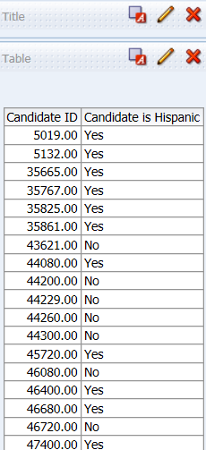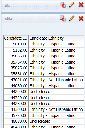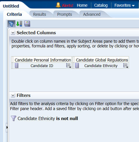 For example: A client may have created a variable named Ethnicity for candidate ethnicity where they trimmed the leading "Ethnicity - " from the ethnicity string and then used the ethnicity variable in an if statement to create a new variable called is Hispanic. We will create an analysis that mimics the following example. Create the analysis using theRecruiting (Legacy) subject area.