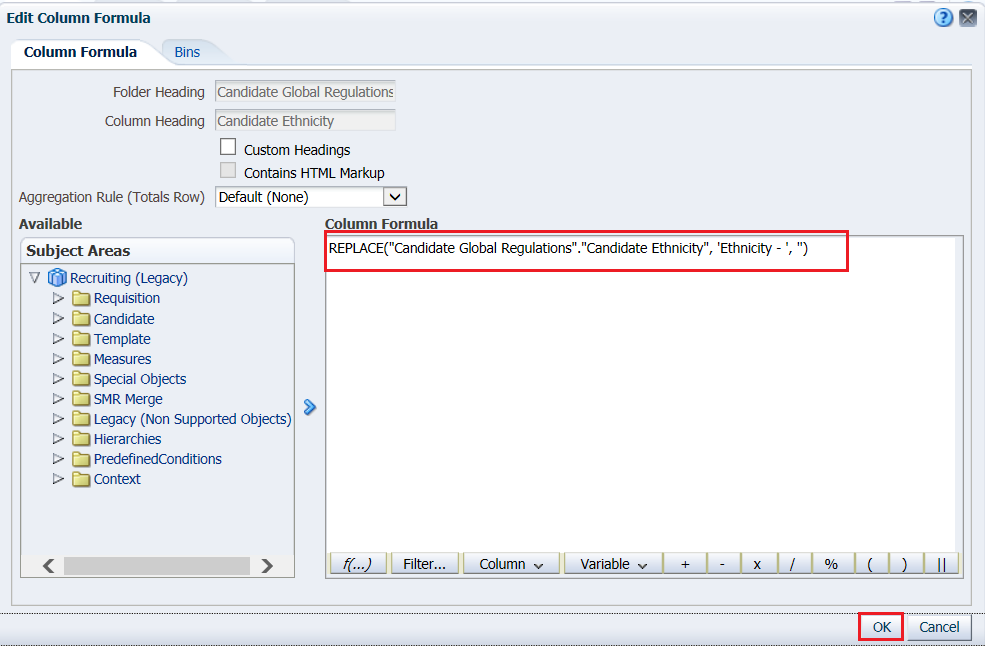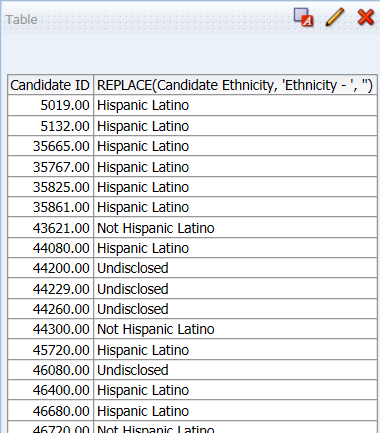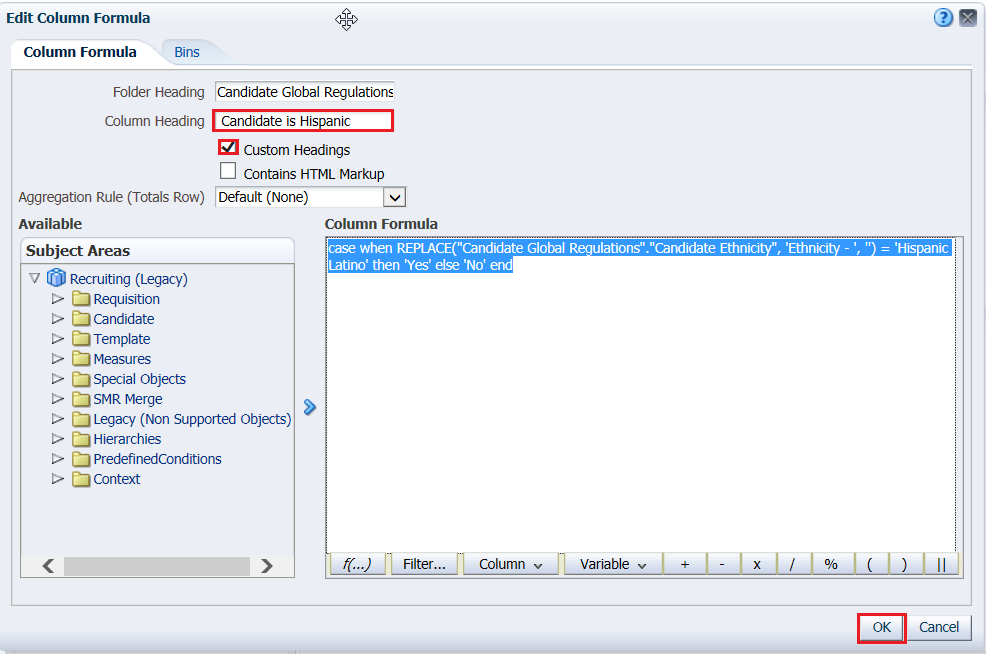 Edit the column formula. Rename the column Candidate is Hispanic. Add the case statement. The formula should look like this: case when REPLACE("Candidate Global Regulations"."Candidate Ethnicity", 'Ethnicity - ', '') = 'Hispanic Latino' then 'Yes' else 'No' end