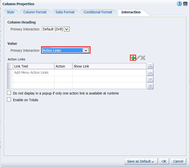 Change the value of the Primary interaction from Default (Drill) to Action Links.