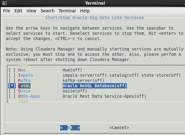 Double-click the Start/Stop Services icon to open a terminal window that shows a list of Oracle Big Data Lite Services: