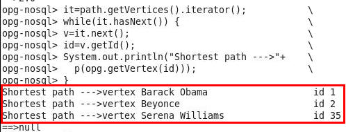 // Find the starting vertex with a text query. // Pick the first one out of the matches as there could be multiple matches. vStart = opg.getVertices("name", "*Obama*", true) \ .iterator().next(); // Then find the destination vertex with a text query vEnd = opg.getVertices("name", "Serena*", true) \ .iterator().next(); // Create the same print helper function as before def p(v) { s1=v.getProperty("name"); \ if (s1.length() > 30) return s1; \ s=s1; \ for (int idx = 0; idx < 30 - s1.length(); idx++) \ { s=s+ " ";}; \ return ("vertex " + s + " id " + v.getId()); \ } -
