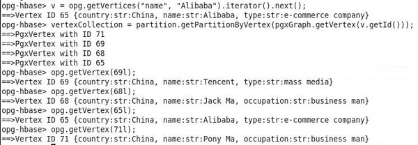 // Look into the community that has the vertex Alibaba v = opg.getVertices("name", "Alibaba").iterator().next(); vertexCollection = partition.getPartitionByVertex(pgxGraph.getVertex(v.getId())); // Get the details of 4 vertices within this community. // "l" below indicates a Long integer opg.getVertex(69l); opg.getVertex(68l); opg.getVertex(65l); opg.getVertex(71l);The expected output of the previous step is shown is shown below: