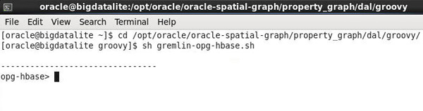 cd /opt/oracle/oracle-spatial-graph/property_graph/dal/groovy/ sh gremlin-opg-nosql.shResult: The Groovy command line environment is launched, as shown here: