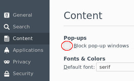 A. select the Content category in the Preferences window navigator. In the Content window, deselect the Block pop-up windows option, as shown here: