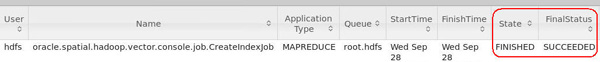 hadoop jar $API_LIB_DIR/sdohadoop-vector.jar oracle.spatial.hadoop.vector.mapred.job.SpatialIndexing -libjars $HADOOP_LIB_JARS input=/user/oracle/HOL/tweets.json output=/user/oracle/HOL/indexGeoJSON inputFormat=oracle.spatial.hadoop.vector.geojson.mapred.GeoJsonInputFormat recordInfoProvider=oracle.spatial.hadoop.vector.geojson.GeoJsonRecordInfoProvider srid=8307 geodetic=true tolerance=0.5 indexName=indexGeoJSON indexMetadataDir=/user/oracle/indexMetadata overwriteIndexMetadata=trueOnce the job is finished, the message "INFO: Job Succeeded" appears in the output.
