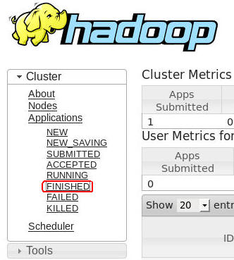 In the Hadoop - All Applications tab, click the FINISHED link, as shown here: