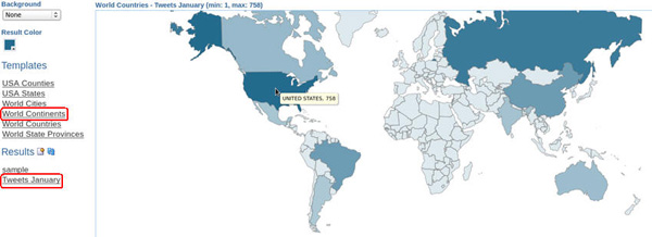 Then, click on Tweets January result. A color-coded map of the world countries appears. Note: You can zoom on the map by double-clicking the image.