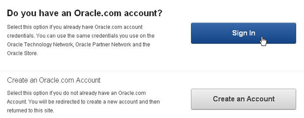 You must have an Oracle.com account. Click Sign In if you already have one or click Create an Account. If you go through the steps to create an account, perform the steps above again and click Sign In on this page.