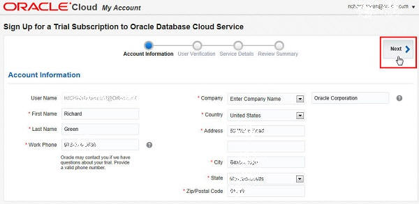 In this section, you enter your account information, specify the name of your Database Cloud Service and agree to the terms to submit your Database Cloud Service trial request. Perform the following steps: