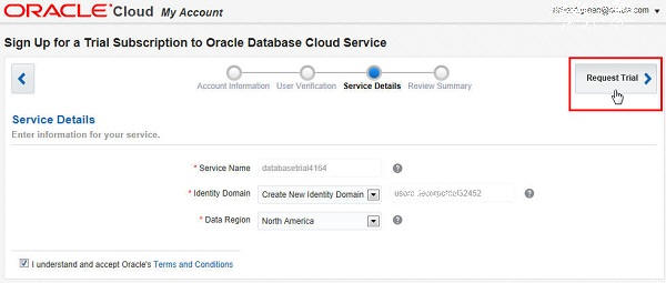 Make note of the Service Name and Identity Domain Name assigned to your trial. Use the checkbox to accept Oracle's terms and conditions, and click Request Trial.