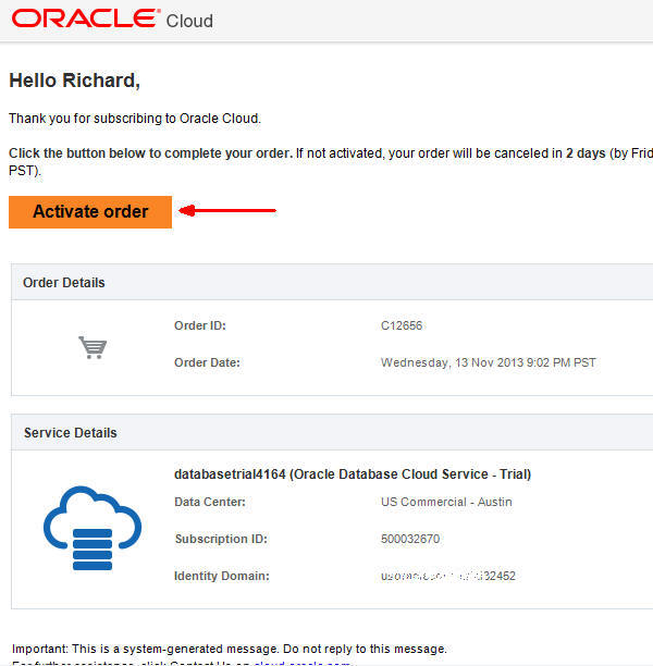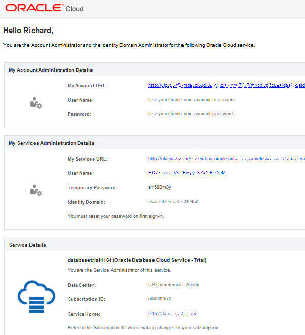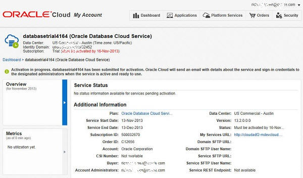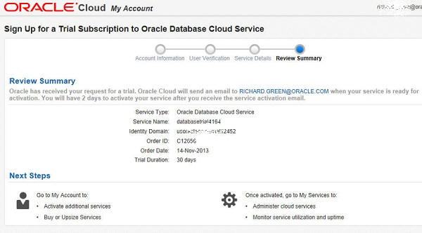 Unlike a paid subscription, Oracle also assigns you the role of Service Administrator for the service, and Identity Domain Administrator as well.- Account Administrator receives a notification email to activate the service.