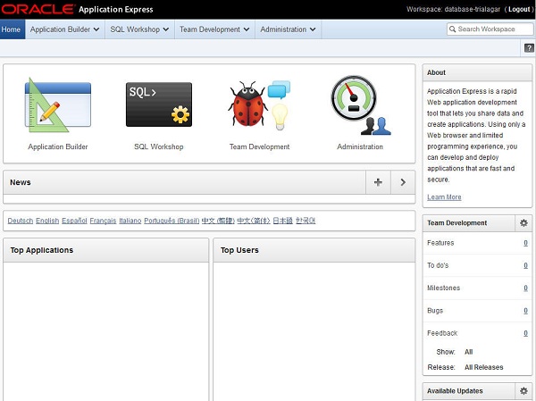 The main Application Express window appears and you can now begin creating your database applications.