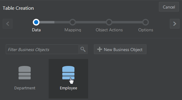 In the Data page of the Table Creation wizard, select Employee.