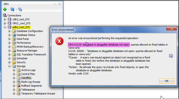 - Back to the pdb2_root_SYS connection, click Datafiles.