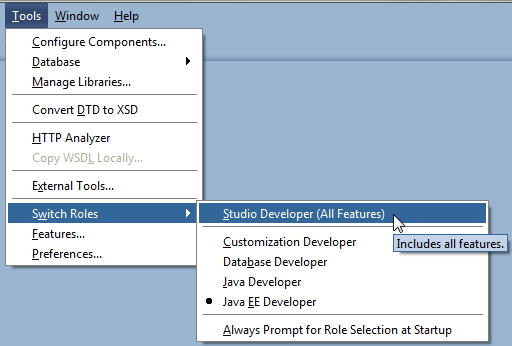 JDeveloper roles enable you to tailor the JDeveloper environment. Some features that are available in one role may not be available in another. The Studio Developer role allows you to access all features of JDeveloper.