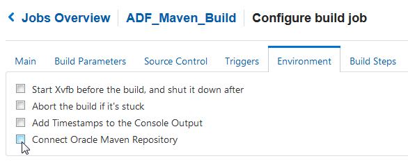 Description of this image In the Environment tab, select the Connect Oracle Maven Repository check box.