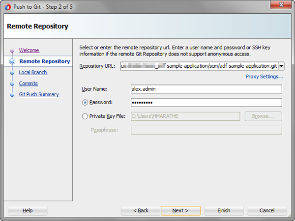 Description of this image The wizard picks the values for Repository URL, Username, and Password from the Team Server. If you prefer to use SSH, update the values of Repository URL and Private Key File before clicking Next.
